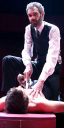 is ripped off and Shylock stands above him, knife raised blood raised. He